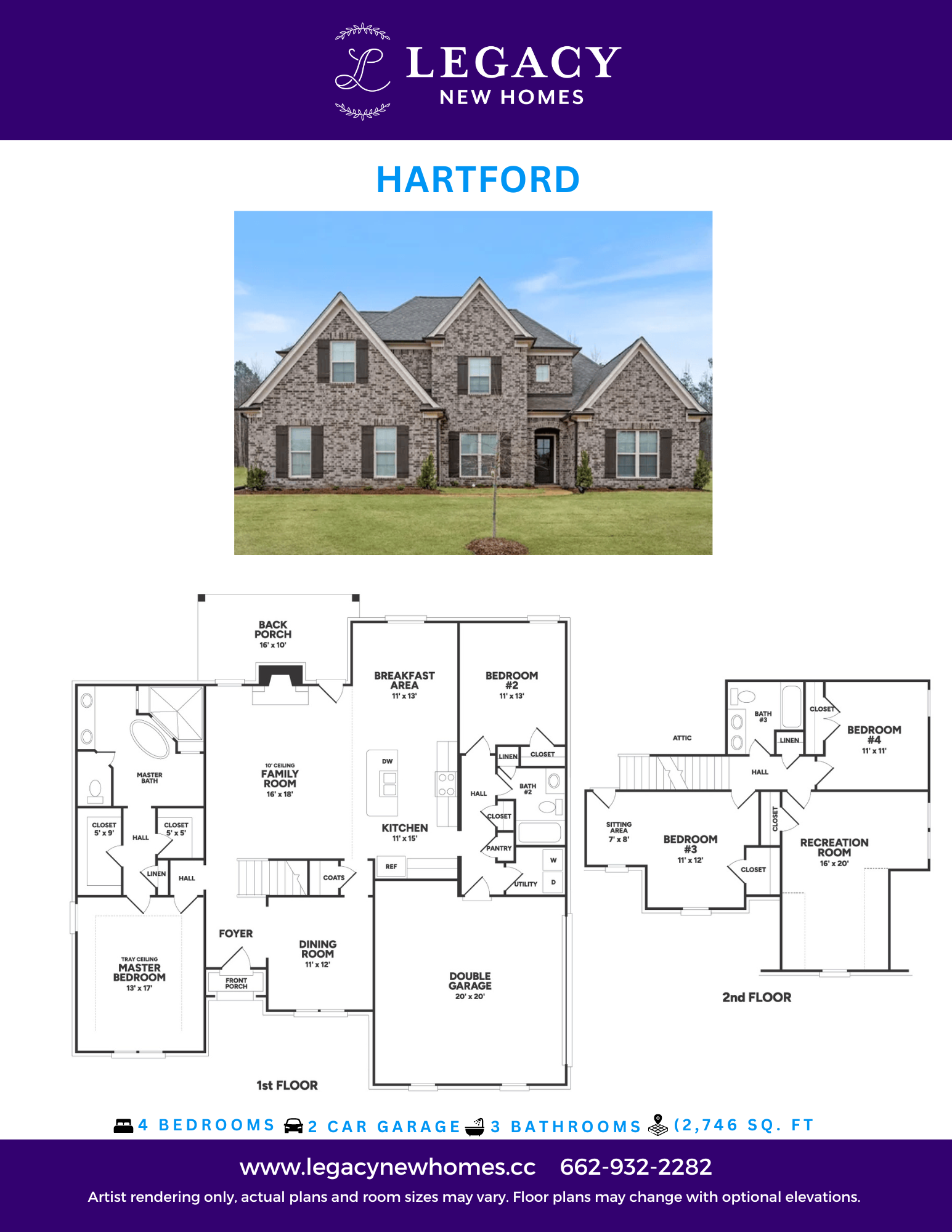 The Hartford offers an open concept floor plan with the kitchen and eating area looking in the family room with gas fireplace. Walking into the home you will see LVP flooring throughout the foyer, dining room, family room, kitchen with eating area, and hallways. The granite island is perfect for bar stools. The kitchen also contains stainless steel appliances. The master bedroom is on one side of the home with a large master bath with a stand-alone tub and walk through shower. On the other side of the downstairs, you will find an additional bedroom, bathroom, and large utility room with LVP flooring. Head upstairs to find two more bedrooms, another bathroom, and large recreational room with a closet that can serve as a fifth bedroom.
