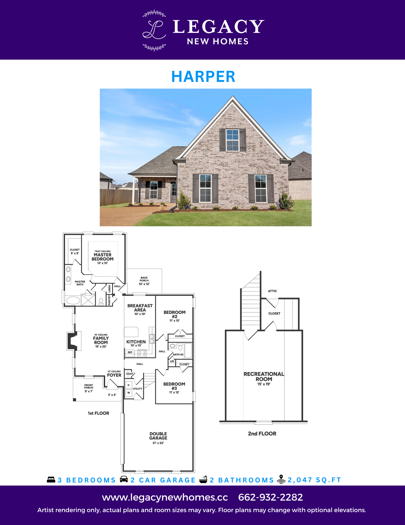 Entering the Harper, you will find LVP floors that flow through the halls, kitchen with eating area, dining room and family room. The family room has a gas log fireplace to keep you cozy warm on the cold winter nights. The kitchen contains lots of cabinets, granite tops, and a large center island perfect for bar stools. On one side of the downstairs, you will find the master suite. The large master bedroom contains trayed ceilings. You walk into a bathroom with a large tile shower, stand-alone tub, vanity with two sinks, and a large walk-in closet. On the other side of the downstairs, you will find two more bedrooms, bathroom, and utility room with LVP flooring. Upstairs is a large recreational room with a closet that can serve as a fourth bedroom.