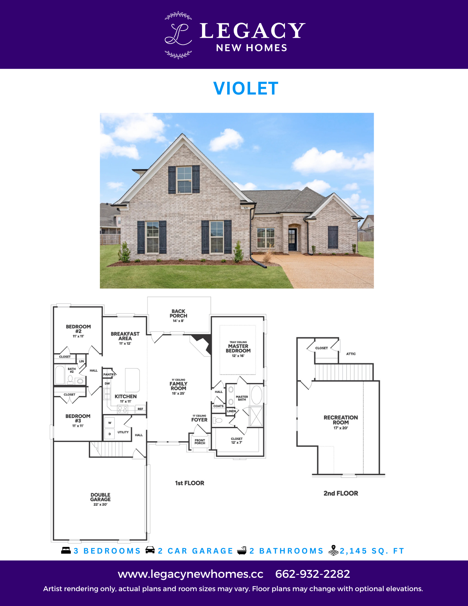 The Violet offers an open concept floor plan with the kitchen and eating area looking in the family room with fireplace. Walking into the home you will see LVP flooring throughout the foyer, family room, kitchen with eating area, and hallways. The kitchen contains stainless steel appliances with granite counter tops. The master bedroom is on one side of the home with a large master bath with a stand-alone tub and tile shower. Share a vanity with two sinks and a large walk-in closet. On the other side of the downstairs, you will find two additional bedrooms and a bathroom. There is also a utility room with LVP flooring. Upstairs, there’s a large recreational room with a closet that can serve as a fourth bedroom.